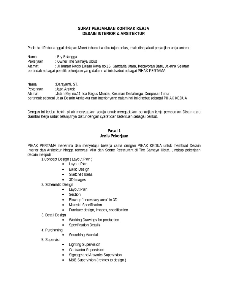 Sebelum tanda tangan, pastikan nama kamu tercantum di dalam kontrak. Ada 2 jenis kontrak kerja karyawan. Free online translation from french, russian, spanish, german, italian and a number of other languages into english and back, dictionary with transcription, pronunciation, and examples of usage. 0 ratings0% found this document useful (0 votes). Agar bisnis atau pekerjaan kita berkembang berikut adalah beberapa kosa kata bahasa inggris yang berhubungan dengan tempat kerja atau kantor yang biasa digunakan. Total swap terindikasi dalam persentase dihitung dengan rumus: Membuat surat perjanjian kerja (spk) atau kontrak kerja menjadi suatu kewajiban bagi karyawan baru. Oleh karena kontrak kerja merupakan acuan untuk karyawan dan perusahaan dalam bekerja sama, isi kontrak kerja merupakan hal yang penting dan dalam prakteknya harus dapat dipertanggungjawabkan. Sebagai karyawan, sebaiknya anda mengenali kontrak kerja, pkwt (perjanjian kerja waktu tertentu) dan outsourcing. Kemudian, pastikan juga kalau pihak satunya yang bertanda tangan adalah orang yang bertanggung jawab atas perusahaan tersebut. Pada video ini, bapak subarja (widyaiswara pusdiklat anggaran dan perbendaharaan) menjelaskan mengenai tata cara penyusunan kontrak kerja pegawai pemerintah. Check 'kontrak' translations into english. Seperti dilansir dari berbagai sumber, surat perjanjian kontrak kerja atau spk akan mengikat kedua belah pihak yang sudah bersepakat.